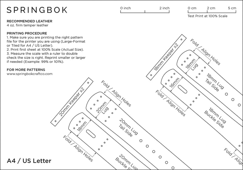 Make your own bespoke watch straps with our classic two-piece watch strap pattern set! Print-ready at home for A4 and US Letter-sized paper.